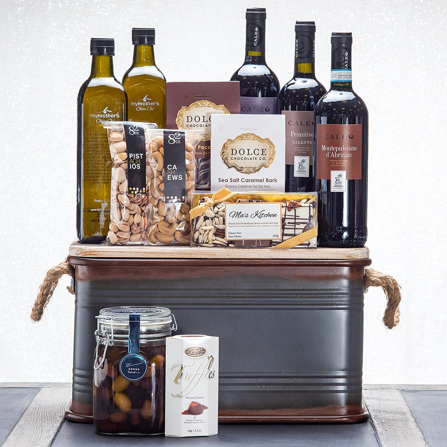 This carefully curated gift includes an array of gourmet treats such as My Mother's Olives olive oil and olives, Chocolat classique truffles, Co.82 pistachios and cashews, Ma's kitchen chocolate bark with nuts, Dolce chocolate co. Sea salt caramel bark, Dolce chocolate co. Dark chocolate pecan bark, and three exquisite Caleo red wines: Montepulciano d'Abruzzo, Primitivo Salento, and Nero d'Avola Sicilia.