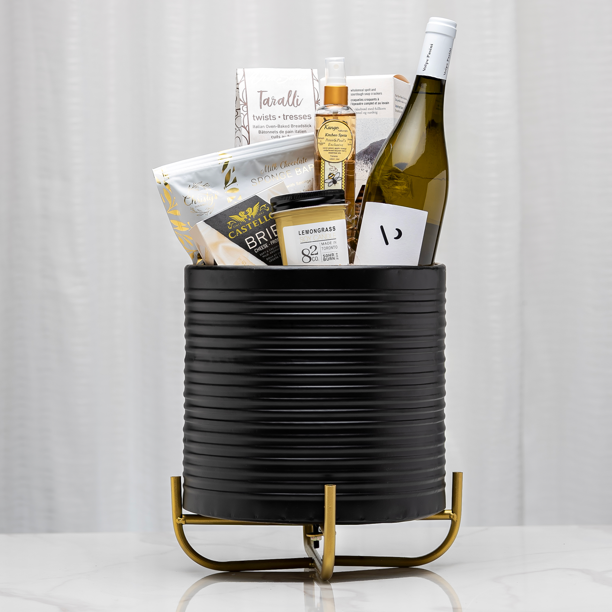 The Kango X PPG Gift Basket is a unique corporate gift that combines sophistication and luxury. Presented in a stunning black planter with gold trim, it is an embodiment of style. This exquisite gift includes a delightful assortment of gourmet treats such as Mor snap crackers, Castello Brie cheese, Taralli twists, and Christy's milk chocolate sponge bark.