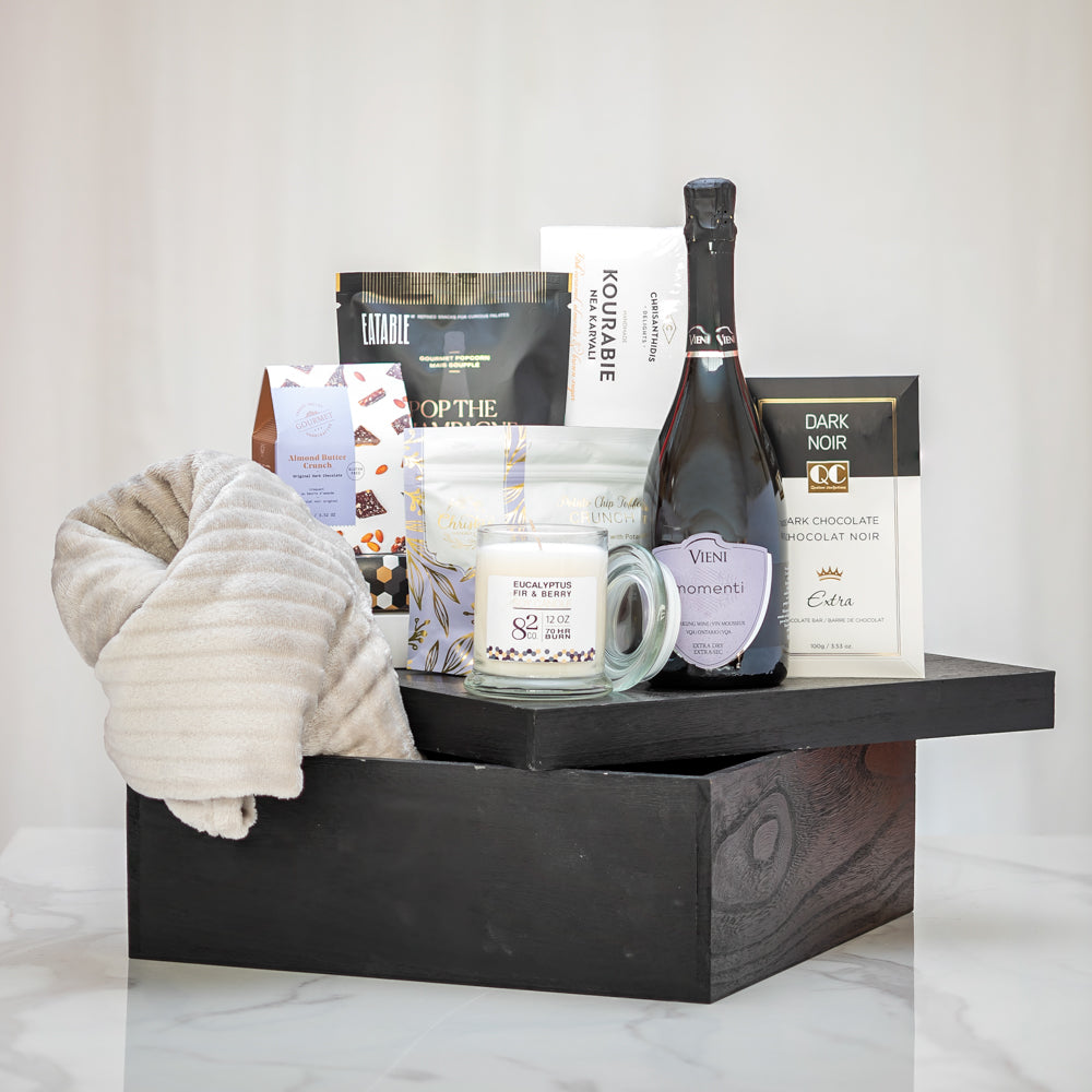 The Cozy Night gift basket is a perfect choice for new grads in need of some well-deserved pampering. Complete with a luxurious Ribbed Fleece Throw, a scented candle by Co.82, and a bottle of Veni Momenti Sparkling Wine, this gift basket creates a cozy ambiance for relaxation. Indulgent treats like dark chocolate, Greek biscuits, and potato chip toffee add a touch of sweetness to their celebration. Cozy Night is a gift that invites the new grad to unwind and revel in their achievements.