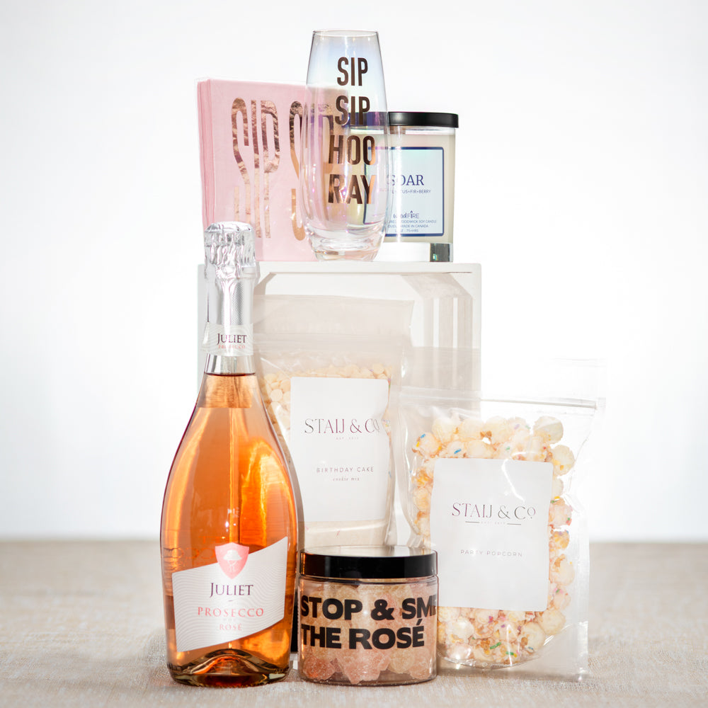 For those looking to toast the accomplishments of a new grad, the Sip Sip Hooray gift basket is a fantastic choice. This delightful ensemble includes a variety of celebratory items, such as a Sip Sip Hooray glass, Juliet Prosecco Sparkling Rosé, and Stop & Smell the Rose Prosecco Gummies. With Staij & co.'s Birthday Cake Cookie Mix and Party Popcorn, they can indulge their sweet and savoury cravings while enjoying the taste of success. Sip Sip Hooray is the perfect gift to honour their achievements and inspire future endeavours.