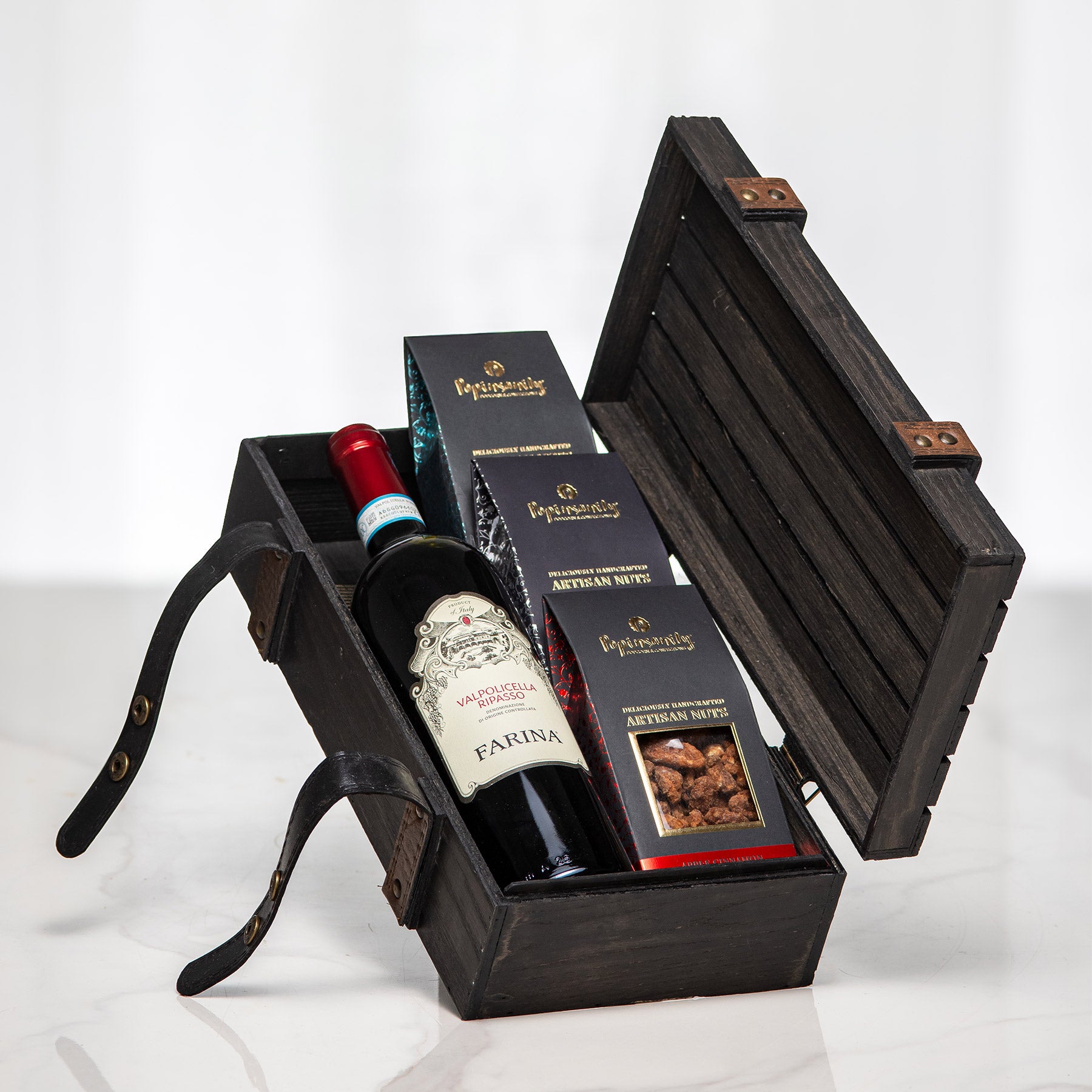 Get “Nuts About Wine” in the best way with this playful collection featuring crunchy Popinsanity apple cinnamon walnuts, toffee praline cashews, and spicy buffalo peanuts—all nestled in a rustic brown slotted wooden crate with leatherette straps. Pair these bold flavours with a bottle of Valpolicella Ripasso Classico Farina Superiore Le Pezze for a tasty twist that’s perfect for snacking, sharing, or unwinding in style!