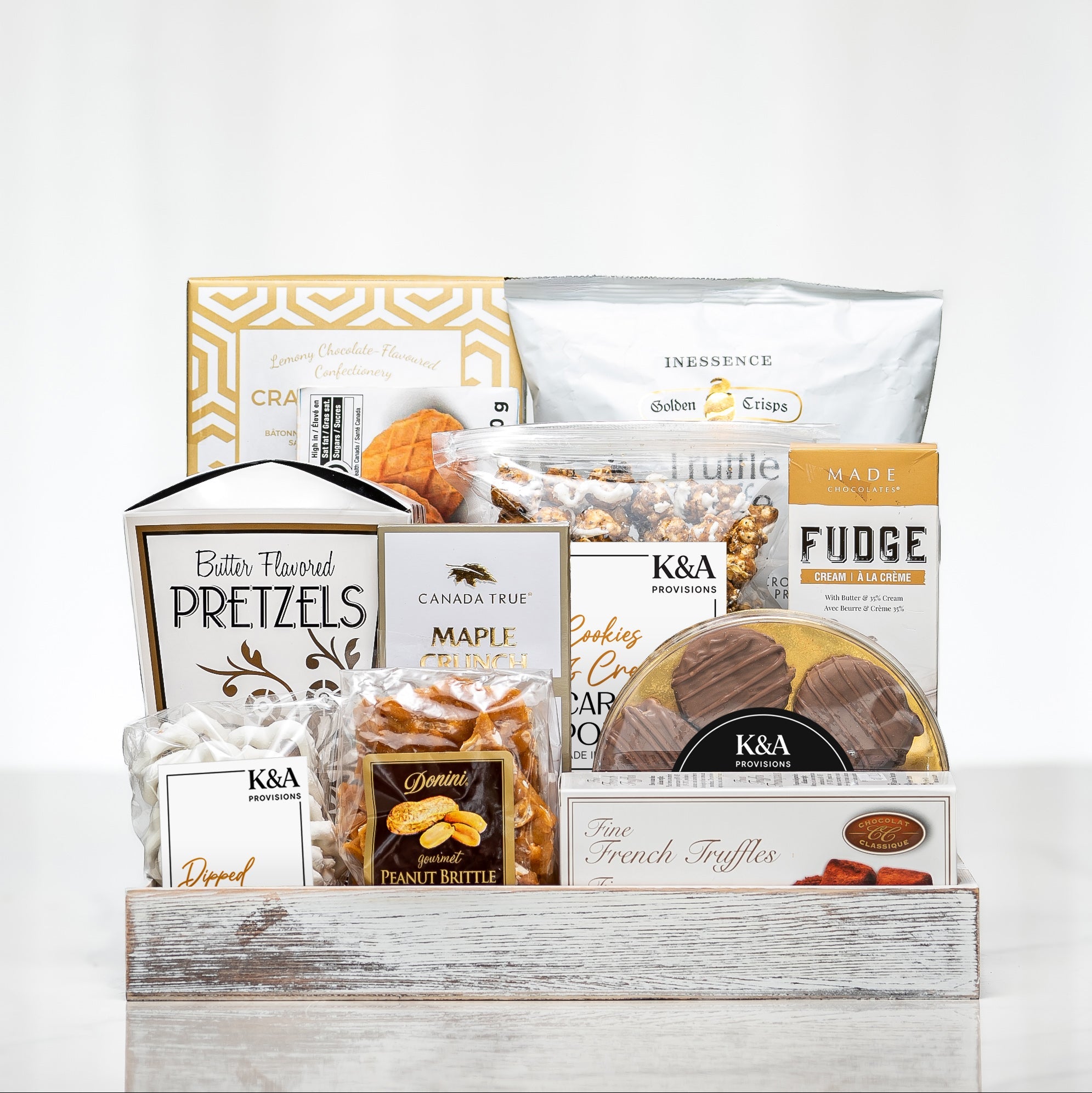This playful gift set “All for One - Small” delivers a delightful taste adventure in every bite. From the crunchy Inessence Truffle Potato Crisps to the smooth richness of Fine French Truffles, each treat surprises your taste buds. Enjoy sweet moments with Waterbridge Chocolate Butter Biscuits, Maple Fudge, and Co. 82 Cookies & Cream Popcorn. Dive into fun with Yogurt Covered Pretzels and a 7-piece Milk Chocolate Covered Oreo box. All packed perfectly in a charming White Washed Wood Tray, it’s a tasty celebration waiting to happen!