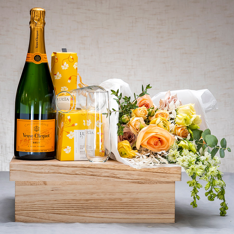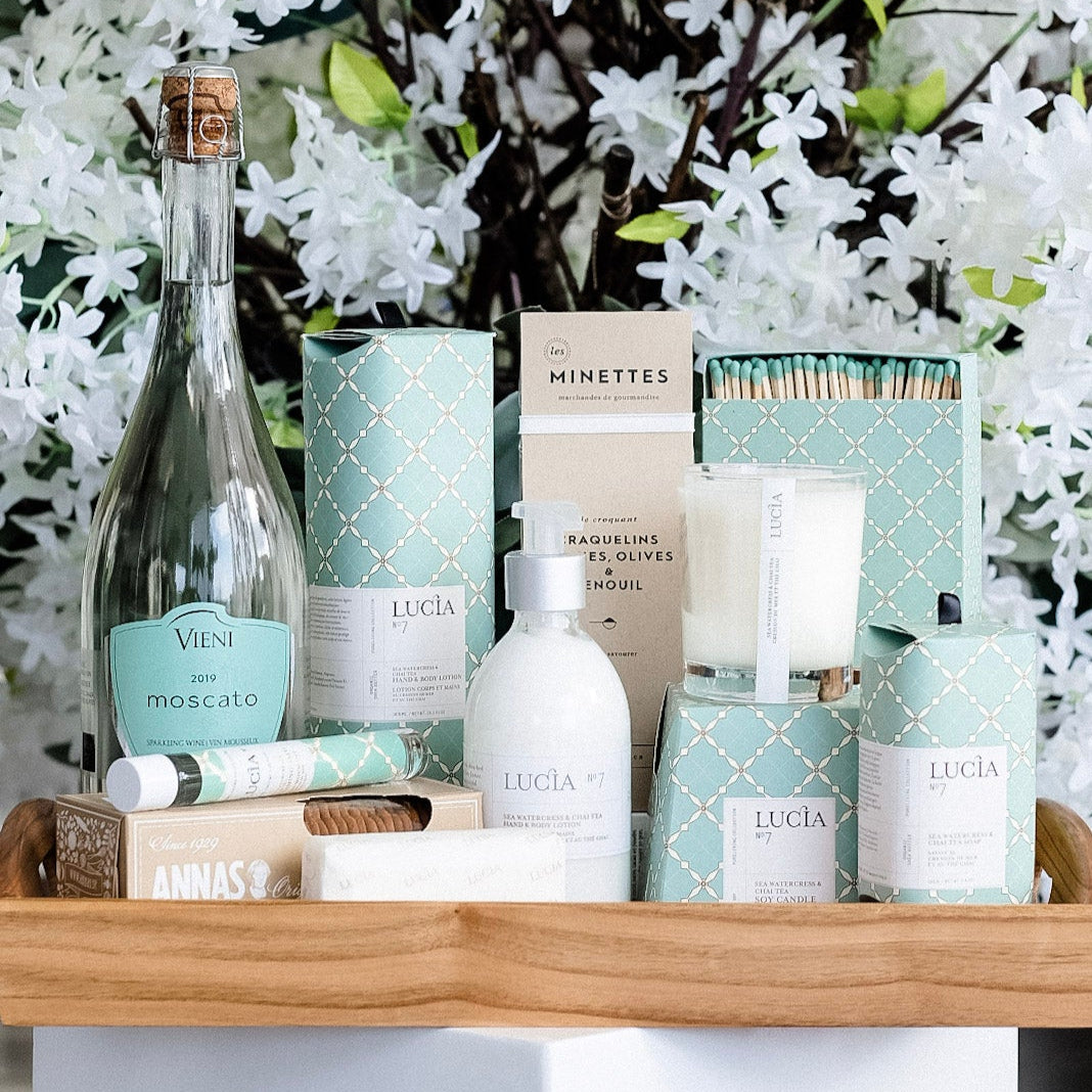 Escape into a relaxing serenity of an at home spa experience with this gorgeous set of luxurious Lucia Sea Watercress & Chai Tea body care. Accompanied by Vieni Moscato and almond thins to treat the most deserving person in your life.