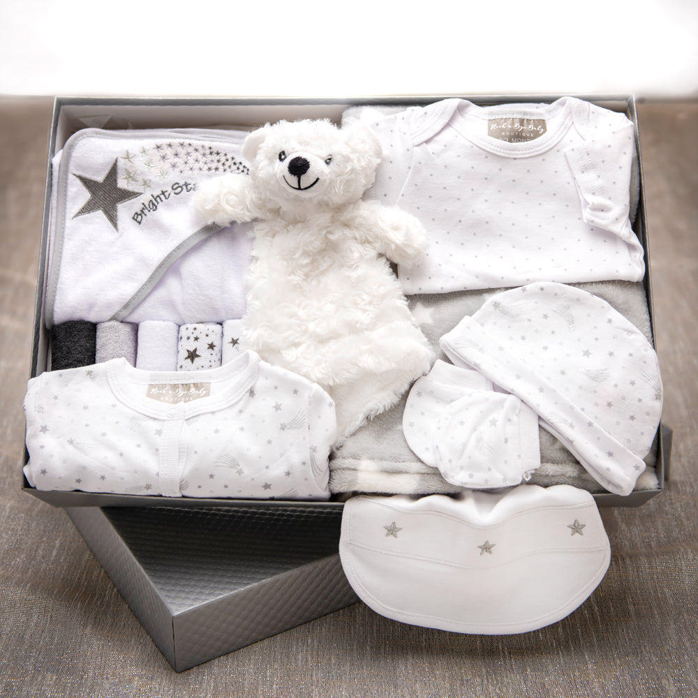 This gift is a star filled with a five piece sleeper set, plush blanket, bear nunu and hooded towel all tucked neatly in a gorgeous gift box.