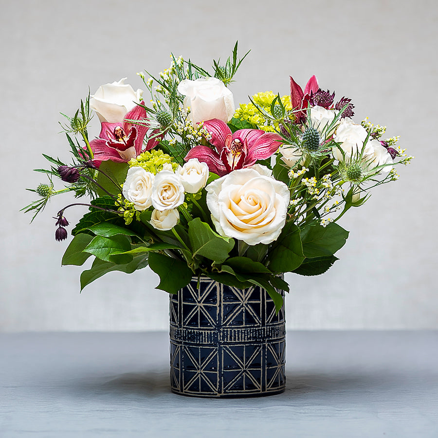Travelling to the country side with this beautiful ceramic plush bowl filled with Orchids, Ranunculus, Spray Rose and greenery.